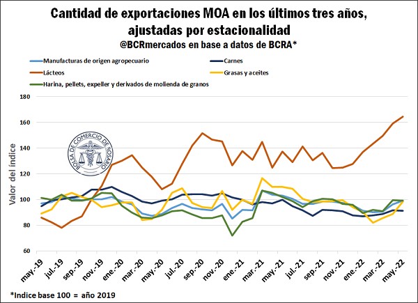 En el segundo semestre de 2019, el complejo lechero creció un 34%, y desde entonces ha mostrado cierta variabilidad en sus incrementos, pero en la primera mitad del corriente año manifestó una rápida escalada creciendo un 22,5% impulsando las MOA hacia arriba.