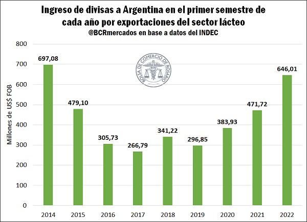 El ingreso de divisas a Argentina experimentó un fuerte incremento como consecuencia de las mayores toneladas exportadas, como así también por los aumentos de precios internacionales. En efecto, en los primeros 6 meses del año se remitieron al exterior manufacturas del sector lácteo por el equivalente a US$ 646 millones, implicando una suba interanual del 36,9%. Siguiendo la lógica comparativa de los últimos tres años, el ingreso de divisas del sector registró un incremento de U$S 349 millones respecto del primer semestre de 2019. Por lo tanto, en 2022 se duplicó con creces el guarismo registrado tres años atrás, y se posicionó levemente por debajo de los máximos históricos mostrados en 2014, en donde ingresaron U$S/t 697 millones.