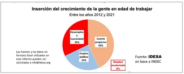 ¿Por qué fracasa una política que goza de tan alto consenso? Para responder esta pregunta resulta pertinente evaluar la dinámica del mercado de trabajo. Según el INDEC, entre los años 2012 y 2021 la población en edad de trabajar creció en aproximadamente 3 millones de personas, las cuales laboralmente se insertaron de la siguiente manera: