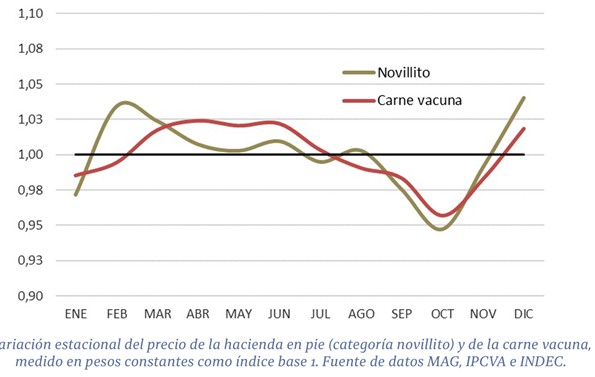 Estacionalmente, las correcciones del precio de la hacienda en pie tienen dos momentos fuertes en el año. Sin embargo, entre ambos eventos se observan diferencias en cuanto al traslado al precio de la carne. Mientras las primeras correcciones estacionales, que suelen darse entre febrero y marzo de cada año, son asimiladas por los mostradores de manera más gradual, involucrando pequeños ajustes en el precio de la carne durante los 4 a 5 meses subsiguientes, el segundo de estos eventos -de una magnitud cada vez más pronunciada en los últimos años- se produce hacia fin de año (noviembre-diciembre), con ajustes en los valores de la hacienda trasladados en forma inmediata a la carne, algo que también se alimenta por una mayor presión de consumo hacia fin de año.