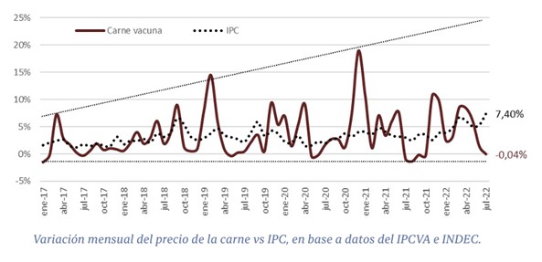 En julio los precios de la carne vacuna prácticamente no registraron variación respecto de junio -de hecho, marcan una ligera caída nominal (-0,04%)- contra un aumento general de precios al consumidor (IPC) del 7,4% mensual. Este diferencial en las variaciones sucede luego de registrar en junio un ajuste de apenas un 1,4% contra un IPC del 5,3% mensual.