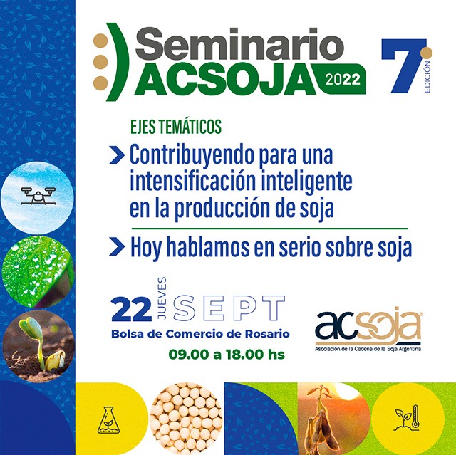 La Asociación de la Cadena de la Soja Argentina (ACSOJA) realizará el próximo jueves 22 de septiembre su Seminario Anual 2022 de forma presencial en la Bolsa de Comercio de Rosario, y también a través de una transmisión online.