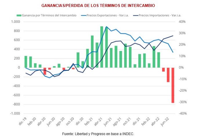 Los economistas señalan que, de haber prevalecido los precios de julio del año anterior, el saldo comercial habría arrojado un superávit de US$ 425 millones en lugar del déficit de US$437 millones registrado. Los precios de las exportaciones registraron su tercer mes consecutivo de desaceleración en la variación interanual, mientras que en cambio los precios de las importaciones siguieron subiendo. En especial hay que destacar la situación de las importaciones de Combustibles (energía), que aumentaron 50,8% interanual en cantidades con precios 111,3% más altos que en julio de 2021.