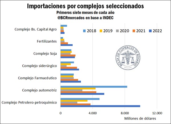 Más aún, la suma de estos tres complejos relativos al agro representa apenas el 7,7% de las importaciones totales en los primeros siete meses del 2022. Este número es menor al 9,4% del mismo período del 2021.