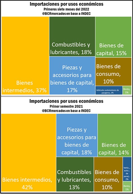 En este marco, gran parte de la suba de importaciones argentina en 2022 se explica por bienes intermedios y energía. Por una parte, los insumos intermedios, el principal renglón de las importaciones argentinas, subieron un 54% en 2021 y un 29% interanual en los primeros siete meses del 2022.