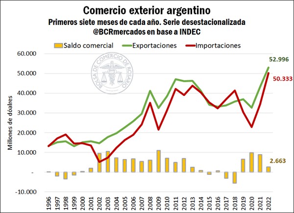 El 2022 ya marca récords en los niveles de importaciones. En los primeros siete meses de este año las importaciones totalizaron casi 50.000 millones de dólares, subiendo casi un 45% respecto al mismo período del año anterior. Este hito importador ha redundado en una merma del superávit comercial, que está en mínimos desde el año 2018, el último año hasta la fecha que mostró déficit comercial a nivel consolidado.