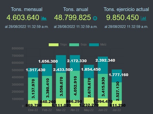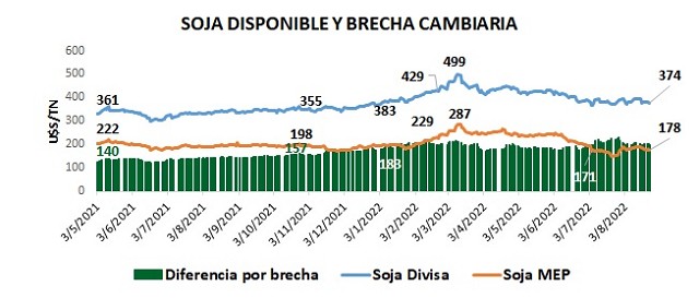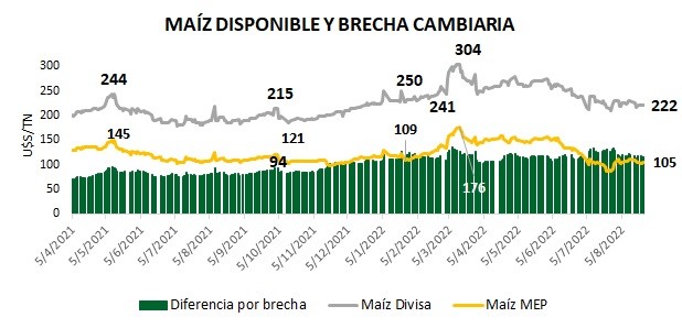 En maíz, el más liquidado de los dos granos para la campaña 21/22 y la futura 22/23, muestra un disponible a U$S 222/TN según el tipo de cambio oficial, mientras el equivalente MEP resulta en U$S 105/TN, 47% del precio disponible al oficial.