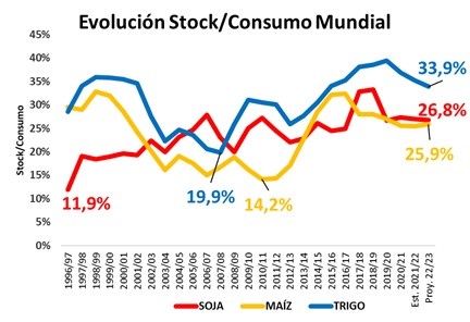 Pero hay números que nos condicionan mucho más que los del USDA, por tanto, hagamos un repaso de la evolución del stock/consumo de granos de las últimas décadas, veamos el estado de situación entre las decisiones de los grandes fondos de inversión los últimos dos años, la evolución de precios y el resultado local en materia de brecha cambiaria.