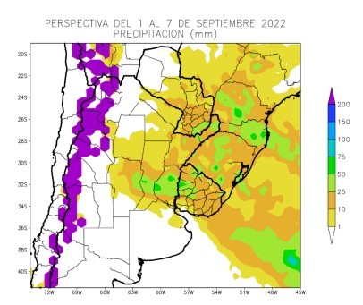 La perspectiva comenzará con lluvias de variada intensidad sobre el centro-este y el nordeste del área agrícola, mientras el oeste y el sur observarán registros escasos a nulos y la Cordillera registrará nevadas en gran parte de su longitud. Junto con las lluvias, arribarán los vientos del sur, causando un marcado descenso térmico sobre la mayor parte del área agrícola, con riesgo de heladas localizadas sobre el oeste, el sur y el centro-este. A continuación, retornarán los vientos del trópico, incrementando la temperatura por encima de lo normal en la mayor parte del área agrícola, con fuertes focos de calor en su porción norte.