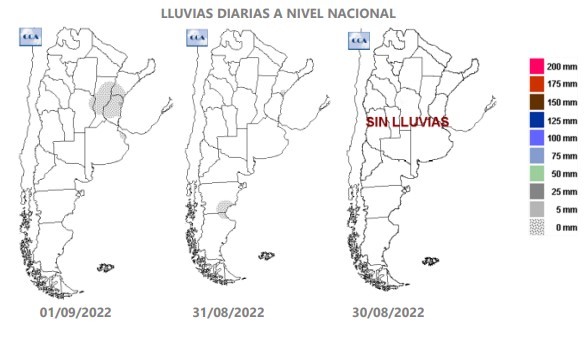 La última semana de agosto sumó otra decepción por los pronósticos de lluvias en la franja central. Se registraron precipitaciones puntuales y escasas: en Baradero 10,2 mm y en Hernando 8 mm. Nada para el resto. Encima hubo heladas, con temperaturas de hasta -4,6°C (Chacabuco) y también temperaturas muy elevadas que alcanzaron hasta los 30°C de máxima y siguen acentuando la desecación de los suelos.