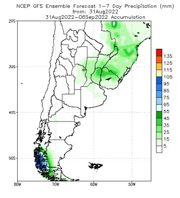 La NOAA muestra pocos milímetros para los próximos 7 días, de hecho lo que se observa son las lluvias pronosticadas para este jueves 1ro de setiembre. Y para los segundos 7 días del nuevo mes, la salida no es más optimistas. “Los modelos matemáticos de mediano plazo plantean condiciones muy poco optimistas para el cambio de mes y, en general, proyectan la continuidad de la reticencia pluvial sobre el centro del país durante la primera década de septiembre”, agrega el consultor Elorriaga.