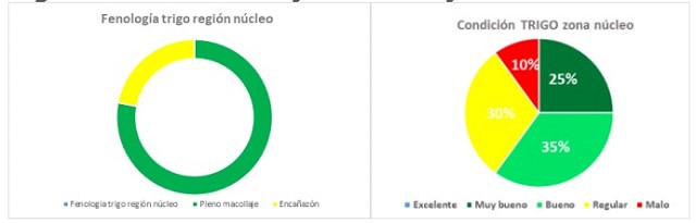 En la región núcleo, en esta semana se nota un marcado aumento de los cuadros regulares y malos: subieron un 15%. Y también desaparecieron los que estaban en excelentes condiciones. Hoy el 10% esta malo, el 30% regular, el 35% bueno y el 25% muy bueno