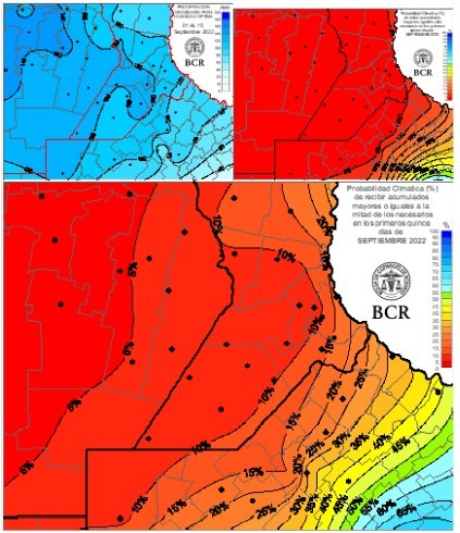 “El retroceso que muestran actualmente las reservas de agua en el suelo requiere, para su recuperación, acumulados de precipitación que están fuera de cualquier estadística favorable”, explica el consultor Elorriaga. Para los primeros 10 días de septiembre, la probabilidad de contar con lluvias de 100 mm sobre la región es menor al 5%. “Requerimos al menos de 30 a 60 mm para poder sembrar”, plantean los ingenieros del área. Pero la posibilidad de 60 mm también tiene baja probabilidad: es del 5% al 10% con gradiente negativo hacia el oeste de la región.