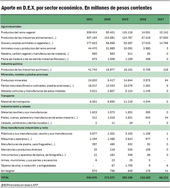 Los principales rubros en términos de aporte en D.E.X. en el 2021 fueron los Productos del reino vegetal y los Productos de las industrias alimentarias, con un 33% de participación sobre el total cada uno. Lo siguieron las Grasas y aceites con un 19% de participación, y los Animales y productos del reino animal en cuarta posición, con el 5% del total aportado en D.E.X. Recién en la quinta posición aparece un sector económico que no esté ligado directamente con el sector agroindustrial; los Productos de la industria química aparecen representando el 4% de la recaudación de dicho año.