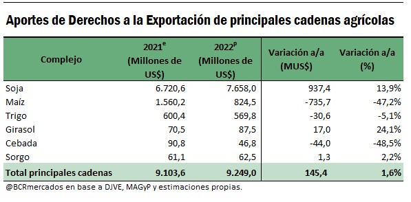 DATO N° 5: Se espera que las principales cadenas agrícolas aporten Derechos a la Exportación por un total de US$ 9.249 millones de dólares ($1.225.473 millones de pesos) para el año 2022.