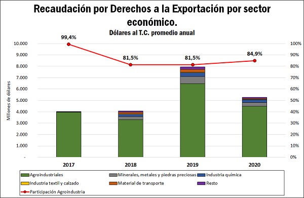 Los Derechos a la Exportación no son exclusivos de los productos agroindustriales, sin embargo, a nivel de alícuotas impuestas y de volumen de recaudación generada, los productos de la agroindustria destacan de sobremanera. El aporte en D.E.X. por parte de los productos de las Cadenas Agroindustriales representaron en el año 2021 el 89% de los $ 943 mil millones que fueron recaudados por el Estado Nacional en este concepto. En 2017, estos sectores habían llegado a representar el 99,4% del total ingresado en Derechos a la Exportación.