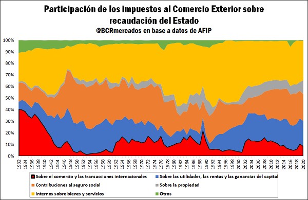 Además del cambio en su importancia dentro de la financiación del Estado, en el último siglo cambió drásticamente la composición de los recursos aduaneros, ganando en participación relativa los Derechos a la Exportación, cuyo impacto apareció de forma significativa a partir de la década del ‘60. Se puede argumentar que ya en la segunda mitad de la década de 1940, con la creación del Instituto Argentino de Promoción del Intercambio (IAPI), operó un sistema implícito de derechos a la exportación móviles, a través del control que el organismo estatal ejercía sobre la demanda interna y la colocación externa de la producción de cereales y oleaginosas del país. Antes de esta experiencia, el grueso de los recursos aduaneros provenía de Derechos a la Importación.