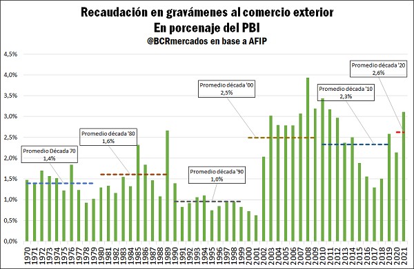 En términos de volumen de recursos recaudados, entre las décadas del ‘70 y del ‘80, los recursos aduaneros representaron cerca del 1,5% del Producto Bruto Interno en promedio, para luego caer en la década del ‘90. A través del levantamiento completo de los arancelamientos para las exportaciones de cereales, y de la reducción de la alícuota al 3,5% para soja y girasol (exceptuado para productos de su industrialización), durante la década de los ’90 se recaudó, en promedio, aproximadamente un 1% del PBI anual en impuestos al comercio exterior. La recaudación por este concepto volvió a incrementarse de forma considerable con la reimposición de aranceles en el 2002, para alcanzar en la primera década del milenio un promedio de 2,5% del producto. Dentro de este período, se registró en 2008 un máximo del 4% del PBI en recursos aduaneros, de la mano de un movimiento ascendente en las alícuotas vigentes y en el marco de un boom del precio de los commodities agrícolas. En el año 2021, la recaudación por gravámenes al comercio exterior alcanzó el 3,1% del PBI, máximos desde 2011.