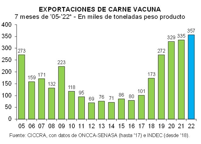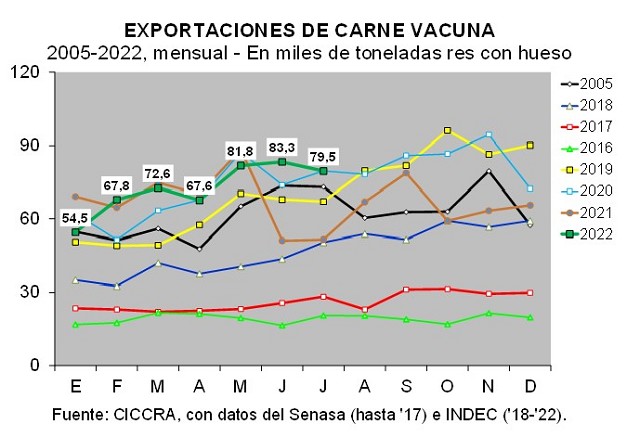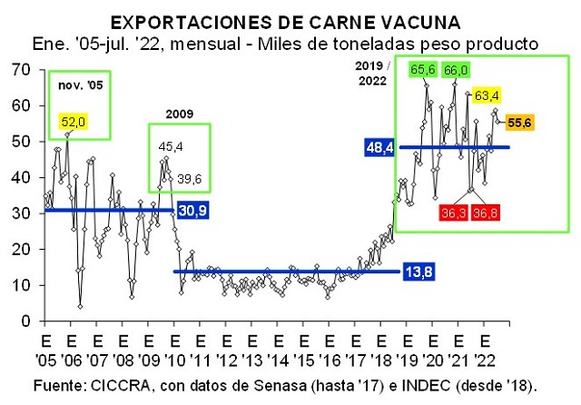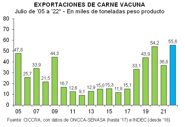 En julio de 2022 el volumen exportado de carne vacuna equivalió a 55,6 mil toneladas peso producto (tn pp; 79,5 mil tn res con hueso), lo que arrojó una caída de 5,4% mensual. En tanto, al contrastar con julio de 2021 la tasa de expansión se mantuvo por encima de 50%, debido a que en aquella época regía la restricción de exportar cortes provenientes de vacas, la cual sólo fue revisada para los envíos realizados a partir de agosto de aquel año.