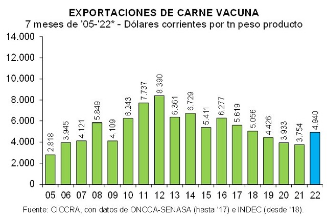 En el caso de los embarques de carne vacuna a EE.UU., y aún a pesar de la elevada volatilidad que vienen mostrando en el mes a mes, todavía se registró un crecimiento de 26,4% anual en los primeros siete meses de 2022. El total exportado a este país equivalió a 11.143 tn pp de carne vacuna (3,1% del total). Por su parte, el precio promedio resultó similar al de un año atrás (+2,1% anual) y se ubicó en 6.661 dólares por tn pp. De esta forma, la facturación sumó 74,2 millones de dólares, lo que arrojó un alza de 29,0% interanual (3,5% del total).