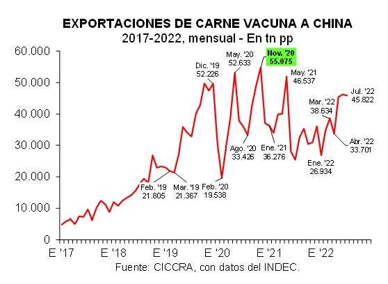 Las ventas a China sumaron 45,8 mil tn pp de carne vacuna en el séptimo mes del año. También se reflejó en la participación de China en las exportaciones de carne vacuna argentina, la que pasó de 69,2% a 82,4% entre julio de 2021 y julio de 2022. En tanto, el precio promedio declarado por estas exportaciones registró un alza de 25,0% anual y se ubicó en 5.101 dólares por tn pp. La recuperación del volumen y el mayor precio promedio generaron una facturación de 233,0 millones de dólares, la que resultó 124,6% mayor a la de julio del año pasado.