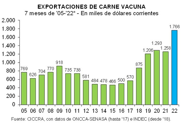 En los primeros siete meses de 2022 las ventas de carne vacuna a China totalizaron 277,4 mil tn pp y representaron 77,6% del total exportado. En relación al mismo período del año pasado subieron 8,3%. Esto fue posible merced a la baja base de comparación que establecieron junio y julio de 2021. Asimismo, el precio promedio subió 42,6% entre los períodos considerados, llegando a 5.020 dólares por tn pp. Producto de todo esto, la facturación creció 54,4% anual y llegó a 1.392,6 millones de dólares (66,3% de los ingresos totales por exportaciones de carne vacuna en enero-julio de 2022).
