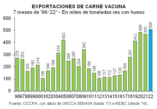 En julio de 2022 el volumen exportado de carne vacuna equivalió a 55,6 mil toneladas peso producto (tn pp; 79,5 mil tn res con hueso), lo que arrojó una caída de 5,4% mensual. En tanto, al contrastar con julio de 2021 la tasa de expansión se mantuvo por encima de 50%, debido a que en aquella época regía la restricción de exportar cortes provenientes de vacas, la cual sólo fue revisada para los envíos realizados a partir de agosto de aquel año. Por su parte, en la perspectiva ‘histórica’, el volumen exportado en el séptimo mes del año fue el más elevado de los últimos veintisiete julios.