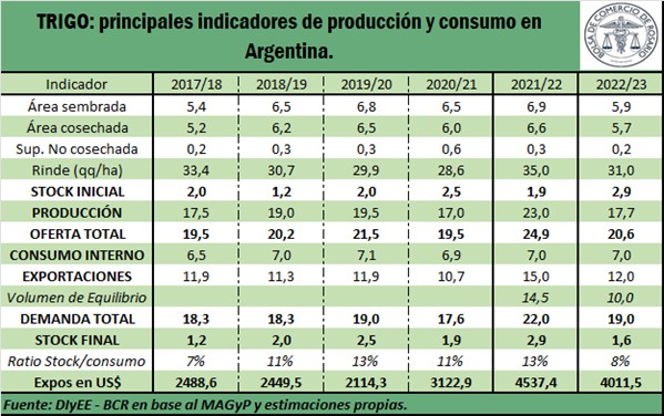Con este panorama, observamos en el siguiente cuadro los principales indicadores más significativos de oferta y demanda que se estiman y proyectan para la actual campaña 2021/22 y para la que está próxima a venir. Se puede apreciar que la proyección del rinde en el ciclo 22/23 podría caer a los 31 qq/ha, junto con menores exportaciones y un stock final disminuido que totalizaría 1,6 Mt, por debajo de las 2,9 Mt del ciclo anterior.