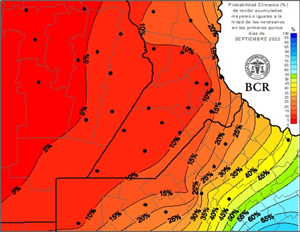 Además, se prevén precipitaciones inferiores a las normales para el trimestre septiembre/ noviembre en el NEA, Santa Fe, centro y este de Córdoba y Santiago del Estero, Buenos Aires, La Pampa, Cuyo y Patagonia. El panorama se ve potenciado si se tienen en cuenta las temperaturas esperadas. En el caso de las temperaturas medias del trimestre se prevén en el rango superior a lo normales sobre la mayor parte del territorio.