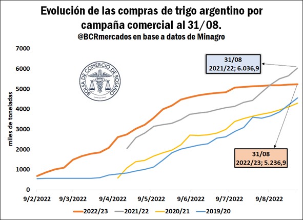 Al 31 de agosto, los datos arrojan un valor de compras internas y DJVE por 5,23 Mt, frente a las 6,03 Mt exhibidas en el ciclo anterior. Desde fines de agosto y principio de septiembre, se ingresó en la etapa crítica de la definición del rendimiento para los trigos sembrados de forma temprana, en mayo. En este sentido, la campaña fina viene con pronósticos desalentadores en torno a las precipitaciones y a la profundización de la tercera Niña que proyecta pocas lluvias hasta noviembre. Además, recientemente una desalentadora helada agravó la situación de los cultivos en la zona agrícola núcleo. Frente a este panorama se espera el resultado de hojas nuevas. No obstante, el problema es que el efecto de la helada fue en contraposición a lo ocurrido en la semana anterior, en donde hubo días de altas temperaturas que alcanzaron los 30 grados.