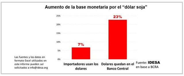 Un aspecto muy importante es que la entrada de dólares al Banco Central implica emisión monetaria. El Banco Central emite pesos para comprar los dólares a los exportadores. Si esos dólares se los vende a los importadores la emisión es absorbida y no tendría impactos inflacionarios. Pero como emite para comprar “dólar soja” a $200 y los vende a los importadores a $140, queda una emisión remanente de $60 por dólar obtenido con “dólar soja”. Es decir que, en el extremo, aun cuando no se acumulen reservas porque el 100% de los “dólares soja” se usan para pagar importaciones, igualmente habrá emisión monetaria debido a los $60 por dólar. Esto agrega más presiones inflacionarias.