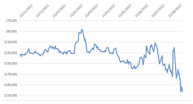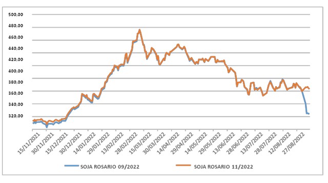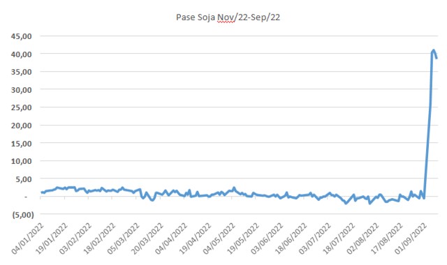 "Más contundente aún es la impactante diferencia que se observa (aprox. 40 U$S/Ton.) en el pase de la soja sep/22 a la soja nov/22 a partir de esta instrumentación" (Gráfico 2).