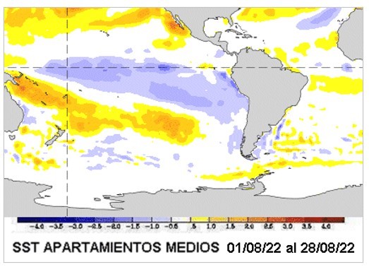 Durante agosto prácticamente no se han detectado cambios de importancias en las anomalías de las temperaturas superficiales del Pacifico central Ecuatorial. Como podemos ver en el mapa, el enfriamiento sigue dominando toda la zona, validando los pronósticos de continuidad de La Niña. Se detectan hacia la costa sudamericana, alguna interacción con temperaturas algo más cálidas, pero las mismas no logran ser influyentes sobre el centro de la cuenca, con lo cual esto no puede tomarse como una señal positiva en cuanto a anticipar un cambio en el patrón instalado.