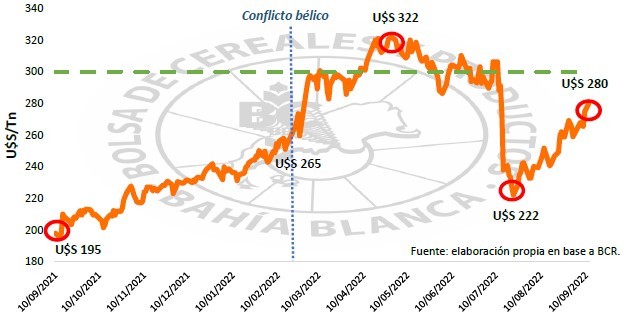 En el último año, el FOB registró una suba interanual de U$S/TN 60. En marzo de 2022, el cereal alcanzó un máximo, superando los U$S/Tn 350. A partir de allí, los valores caen, replicando, en parte, la tendencia internacional y alejándose del máximo. Sin embargo, durante agosto y lo que va de septiembre, la tendencia es positiva, con valores que se aproximan a los U$S/Tn 300.