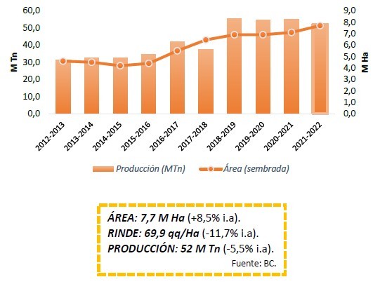El área sembrada en el ciclo 2021/22 fue la más alta de los últimos ciclos, alcanzando las 7,7 M Ha (BC).