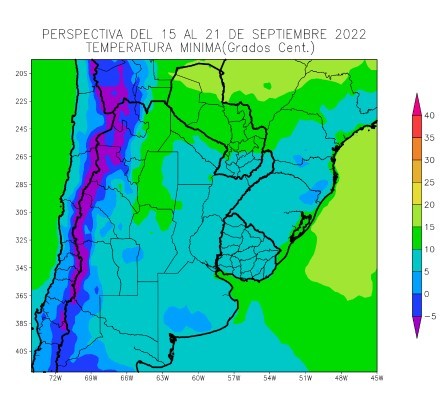 • El este del NOA, la mayor parte de la Región del Chaco, la Mesopotamia, gran parte de Cuyo, la mayor parte de la Región Pampeana, el sudeste del Paraguay y el Uruguay observarán temperaturas mínimas superiores a 5°C, con focos con valores superiores y otros inferiores y riesgo de heladas localizadas.