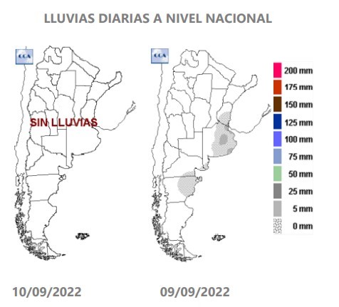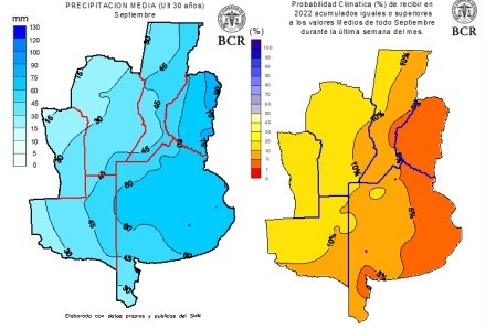 Elorriaga agrega: “los pronósticos de mediano plazo indican la posibilidad de algunas precipitaciones previas al inicio de la primavera pero, en general, alejadas de los valores medios estadísticos del mes de septiembre y con una distribución geográfica que nuevamente favorece en mayor medida al territorio bonaerense”. El consulto agrega: “la posibilidad de alcanzar los valores normales del mes, aproximadamente entre 40 y 80 milímetros, con lluvias durante la última semana de septiembre solo tiene una probabilidad estadística de 5 a 10% de concretarse”.