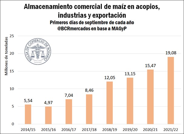 A principios de septiembre, el almacenamiento de maíz en acopios, industrias y puertos de exportación totalizó más de 19 Mt. Este volumen de stocks próximos a volcarse al consumo interno y a la exportación marca un récord para cualquier mes del que existan registros, que inicia en febrero de 2015. No obstante, debido a que las últimas campañas del grano han sido de las más importantes de la historia, probablemente nos encontremos ante el mayor volumen de almacenamiento histórico en nuestro país.