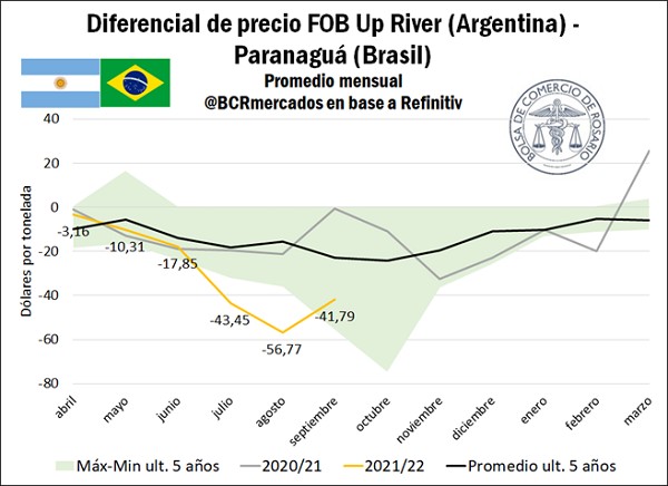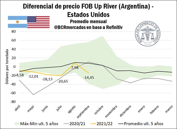 Más aún, el diferencial actual es casi el doble del promedio de US$ 23/t de las últimas cinco campañas. Asimismo, en los últimos veinte años, este diferencial promedio sólo fue superior a estos valores en 2020 y 2012 para el mes de septiembre.