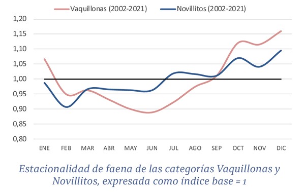 Si bien ambas categorías presentan diferentes curvas de estacionalidad, en ambos casos el segundo semestre resulta superior al primero, con faenas crecientes y superiores a 1 a partir del mes septiembre, para alcanzar su pico máximo en diciembre con índices de 1,12 a 1,16 para machos y hembras, respectivamente.