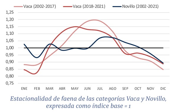 En el caso de las vacas, si cortáramos esta serie en el año 2018 -previo a la irrupción de China como fuerte comprador de esta categoría- veríamos que su pico de oferta estacional se produce durante los meses de junio-julio, coincidente con el descarte de vacas vacías luego de los tactos, donde se registran índices de faena cercanos a 1,20 para luego descender a valores por debajo de 1 desde septiembre hasta marzo.