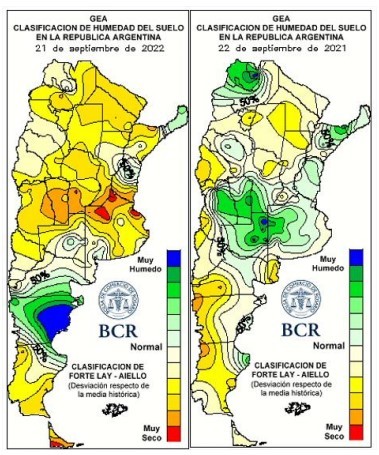 Lamentablemente, en el 2022 se da lo contrario: las primeras lluvias importantes de la región pampeana llagaron entre el 18 y 19 de setiembre. Solo dejaron más entre 15 y 30 mm en el SE de Córdoba, en una pequeña franja del centro sur de Santa Fe, y en SO bonaerense. Solamente, en el centro de la provincia de La Pampa los acumulados estuvieron entre los 30 a 60 mm.