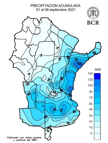 Con estas lluvias acotadas, el trigo cumple con sus etapas de macollaje, encañazón y espigazón. Por lo que el déficit hídrico se agrava en el norte, oeste y centro del país. Los lotes de trigo de la provincia de Córdoba, Chaco, Santiago del Estero, sur de Santa Fe y norte de Buenos Aires son los más afectados. Hubo una buena, las lluvias de esta semana sorprendieron y dejaron más milímetros de los que se esperaban, pero alcanzaron una zona muy acotada de Córdoba: los departamentos de Marcos Juárez y Unión. Aun así, se estiman en la provincia 400 mil ha en condiciones regulares y casi 200 mil malas. En Chaco hubo algunos milímetros esta semana pasada: 1 a 5 mm. El agua es insuficiente para el cultivo que está avanzado, sin desarrollo, golpeado por las heladas tardías y tapado por las malezas. Se proyectan 6 quintales en numerosos lotes. Hay grandes áreas muy afectadas con cuadros a punto de perderse.