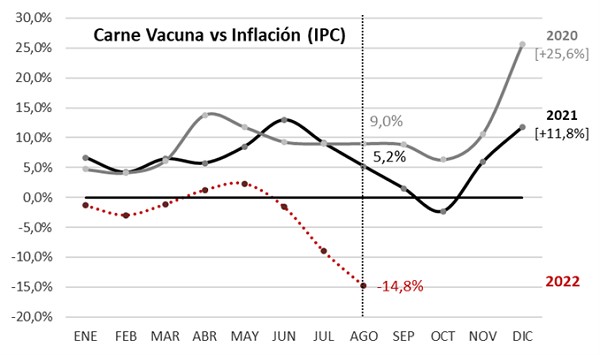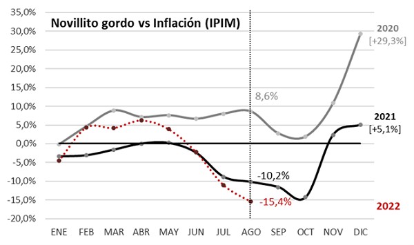 Localmente, el producto final claramente no logra encontrar tracción en la demanda. En agosto, según el relevamiento de precios minoristas que realiza mensualmente el IPCVA, la carne vacuna aumentó 1,2% contra un aumento general de precios al consumidor (IPC) que avanza a un ritmo del 7% mensual. En lo que va del año el precio de la carne al mostrador acumula una suba del 31,3% mientras que la tasa de inflación de los primeros ocho meses del año asciende al 46,1%, lo que determina una pérdida de valor en términos reales de casi 15 puntos. Si lo comparamos la trayectoria del año pasado, vemos que recién en octubre se generaba un primer retraso contra inflación que rápidamente era corregido con una suba de precios de casi 20 puntos entre noviembre y diciembre de 2021. En tanto este año, el precio de la carne no ha mostrado grandes avances durante el primer semestre, deteriorándose drásticamente en los últimos dos meses.