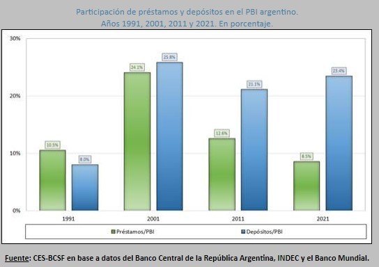 En el sistema bancario argentino, los montos más actuales de depósitos sobre el nivel de préstamos reflejan una relación de aproximadamente 3 a 1 (por cifras de USD 26.615 millones y de USD 26.615 millones, durante el 1er semestre de 2022)