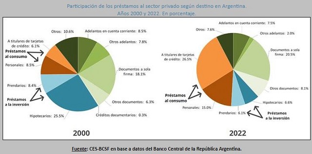 Además, del tamaño relativamente pequeño que mantiene el sector financiero-bancario en Argentina, el informe remarca que el destino de los préstamos se fue concentrando en actividades vinculadas al consumo, tal como lo muestra el cuadro que refleja en porcentajes, lo sucedido entre 2000 y 2022.