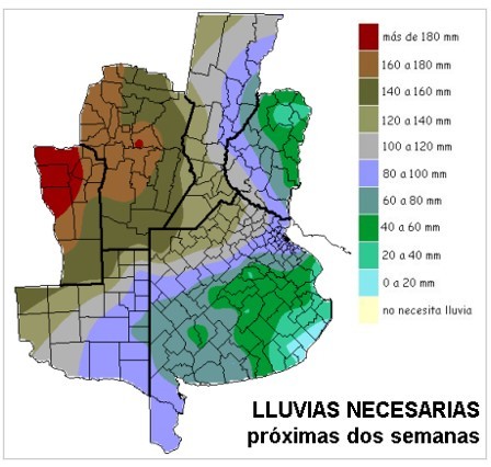 Las razones por las cuales la situación no da lugar al optimismo residen principalmente en la alta demanda pluvial y en la pobre oferta de agua que siguen mostrando los pronósticos para la primera quincena de octubre. Veamos el mapa de lluvias necesarias para las próximas dos semanas si se pretende recomponer la disponibilidad hídrica de una pastura a niveles adecuados.