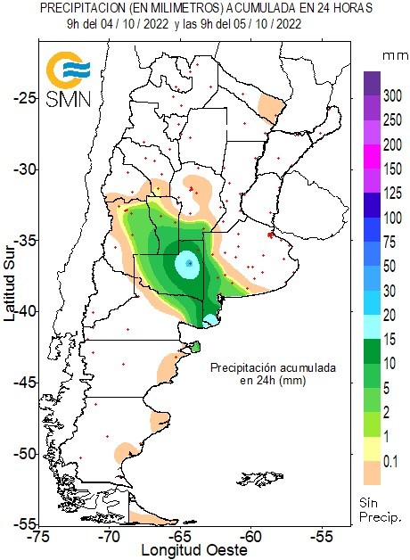 De alguna manera el mapa cuantifica la crisis de la situación pluvial prácticamente en toda la región pampeana. Sobre el este se ve una leve disminución sobre la demanda de lluvias, pero incluso pedir entre sesenta y ochenta milímetros en las dos primeras semanas de octubre, sería casi como pedir el comportamiento ideal, estadístico de las precipitaciones.