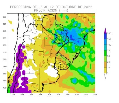 Al comienzo de la perspectiva se completará el paso de un frente de tormenta, que inició su recorrido en los días precedentes, concentrando su acción sobre el Nordeste del área agrícola, mientras que el resto de su extensión observará valores moderados a escasos y la Cordillera volverá a observar nevadas en sus porciones sur y centro. Detrás del frente tendrá lugar una vigorosa entrada de vientos polares, con riesgo de heladas en gran parte del oeste, la mayor parte de la Región Pampeana y gran parte del Uruguay. A continuación, se producirá una vigorosa entrada de vientos del trópico, provocando temperaturas sobre lo normal en la mayor parte del interior del área agrícola, mientras que el Litoral Atlántico experimentará valores moderados, debido a la entrada de vientos marinos.