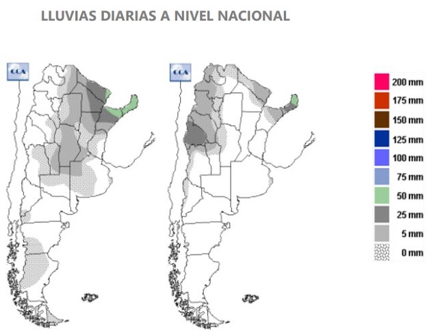 Es efectiva la pérdida del 10% de la superficie triguera. Restan 400.000 ha, un 34%, en muy malas condiciones que podrían seguir el mismo destino. Las lluvias llegaron para muy pocos, solo 3 estaciones del norte de la región registraron lluvias en torno a los 15 mm: Pellegrini, Classon y Pozo del Molle. Y solo un 30% de la región superó los 5 mm. La peor parte se la lleva el SE santafesino en 2 a 4 mm y el NE con numerosas localidades en cero. Este evento está muy lejos de mostrar un cambio de rumbo en el patrón seco que afecta al centro de la región pampeana. Se espera una circulación muy importante de aire frío y seco que va a afectar severamente a Córdoba y Buenos Aires, y en menor medida en Santa Fe. Hay riesgos de heladas moderadas en un momento clave del trigo: el cultivo está emitiendo la espiga que es susceptible y “define la cantidad de granos a formar y también el peso potencial”. También esta circulación fría aleja la positividad de lluvias en los próximos 7 días.